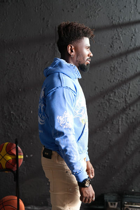 Elite Saints Blue Washed Rhinestone Premium Mens Hoodie + Pearls
